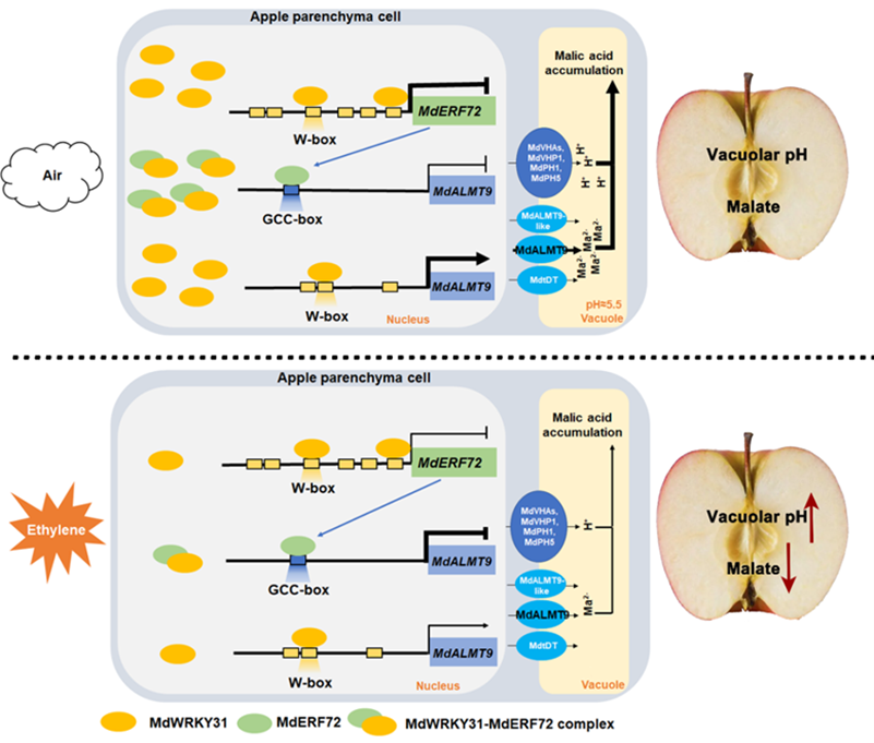 进一步以MdERF72蛋白为诱饵,利用酵母双杂交筛库实验,获得一个与MdERF72互作的WRKY家族转录因子MdWRKY31,并且MdERF72与MdWRKY31蛋白间的相互作用,缓解了MdERF72对MdALMT9的转录抑制活性。除了蛋白间的相互作用,MdWRKY31也可以直接结合MdERF72和MdALMT9的启动子,分别在转录水平抑制MdERF72和激活MdALMT9基因表达。最终,提出乙烯通过抑制MdWRKY31表达,抑制其与MdERF72和MdALMT9的调控和相互作用,进而直接和间接降低了MdALMT9表达,导致液泡中苹果酸积累减少和果实酸度降低,降低苹果果实风味和贮藏性能。