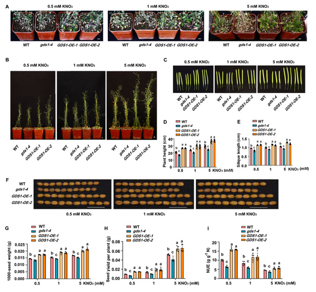 GDS1过表达能延迟高氮和低氮条件下叶片的衰老,提高单株产量和氮素利用率;且氮素供应越少,其增产效果越好(图2)。本研究揭示了一条植物调控低氮诱导衰老的新通路,为培育较低供氮条件下高产不早衰的作物新品种、解决低氮下早衰低产的问题提供了新思路。