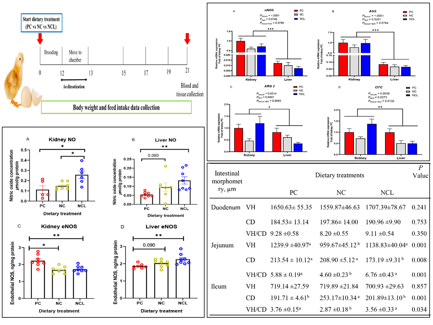 精氨酸是肉鸡营养中的第五限制性氨基酸,对家禽的蛋白质合成、免疫和生产性能至关重要。由于现代肉鸡品系经历快速生长和蛋白质沉积,表现出精氨酸-赖氨酸拮抗作用,并且具有有限的内源性合成,因此肉鸡日粮精氨酸需求需要优化。精氨酸和L-瓜氨酸都是尿素循环中的代谢中间体,通过酶促反应,L-瓜氨酸可以转化为精氨酸或一氧化氮(NO)。本研究比较了精氨酸(PC)和L-瓜氨酸(NCL)对精氨酸缺乏(NC)肉鸡的日粮补充效果。如图1所示,评估了肉鸡的生产性能、血液生化指标、氨基酸谱、组织浓度和精氨酸代谢酶的基因表达、肠道形态以及肠道中营养转运蛋白和紧密连接蛋白的基因表达。结果表明,L-瓜氨酸支持精氨酸代谢和一氧化氮合成,并进一步提供肉鸡肠道功能。
