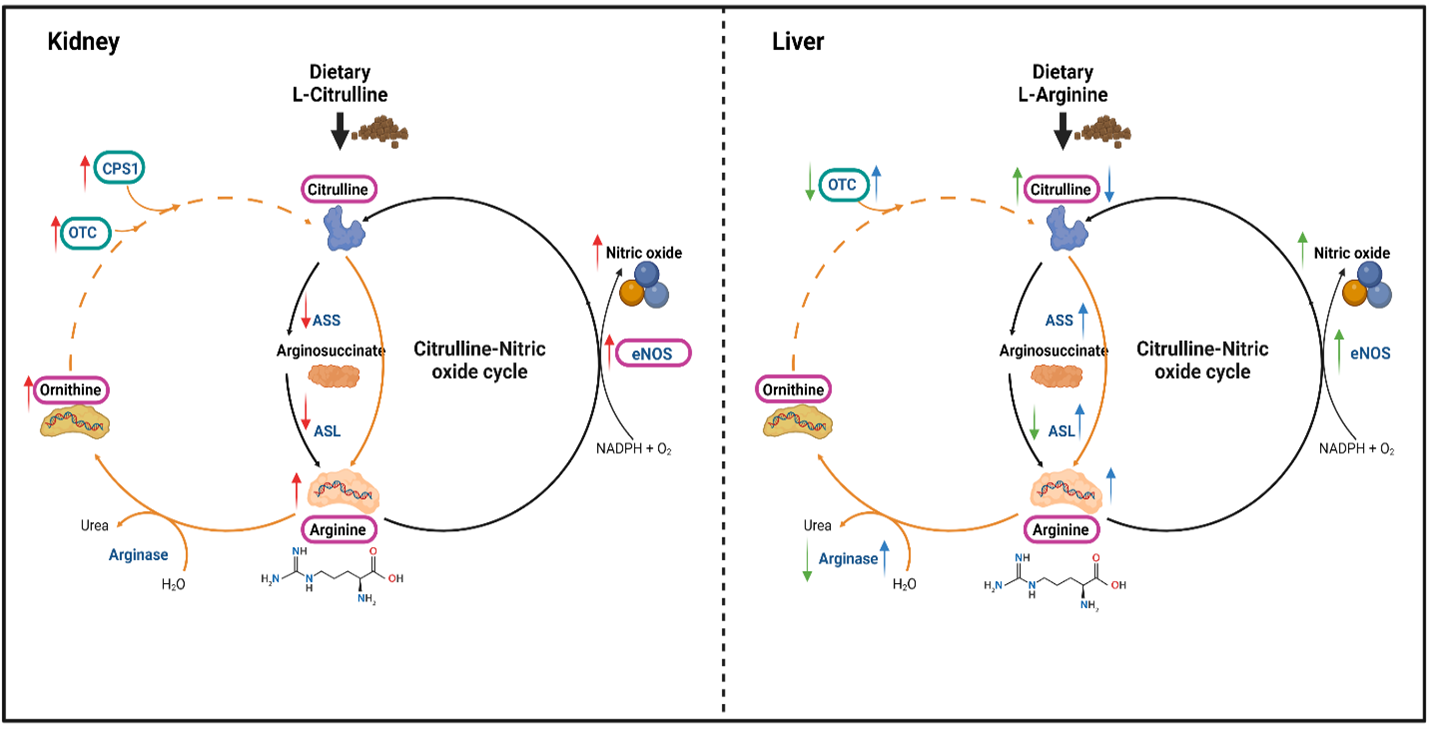 图2. 瓜氨酸—一氧化氮循环示意图。描述肾和肝组织中精氨酸转化为瓜氨酸的过程