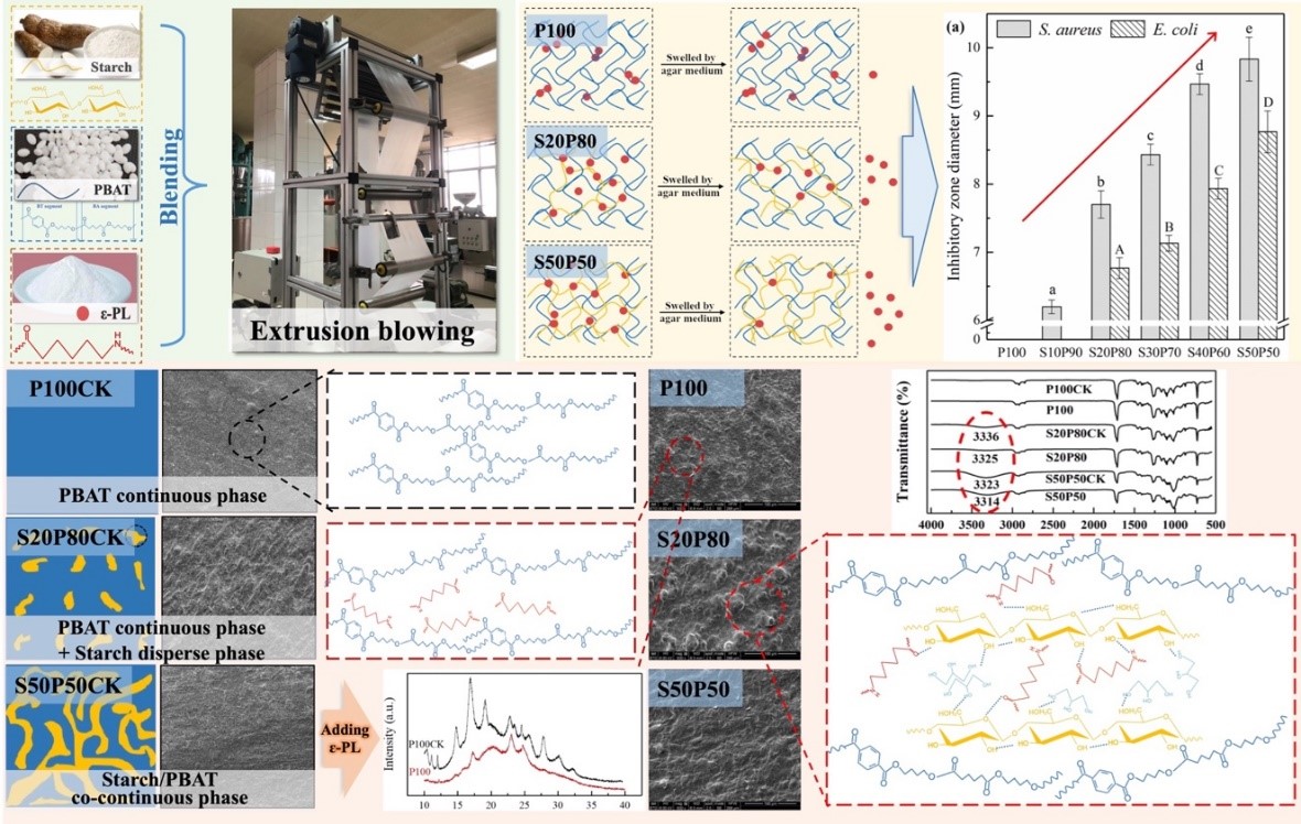 图1. 淀粉/PBAT/ε-聚赖氨酸盐酸盐复合膜制备流程、相形态演变及控释机理