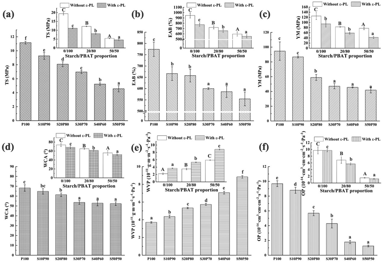 图2. 淀粉/PBAT/ε-聚赖氨酸盐酸盐复合膜的力学性能、表面疏水性及阻隔性能