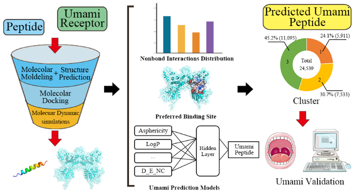 鲜味肽可通过与口腔鲜味受体T1R1和T1R3结合来增强食物鲜味。其中,长度为2-4个氨基酸的小肽占已报道肽的近40%。鉴于氨基酸和肽序列的多样性,鲜味小肽拥有巨大的未开发潜力。本研究通过分子对接和分子动力学模拟筛选了168,400条小肽中能与T1R1/T1R3活性口袋结合的候选肽,探讨了结合类型、氨基酸特征、首选结合位点等。利用多维分子描述符(序列信息、成键信息和拓扑信息)和BPNN神经网络建立了鲜味预测模型,准确率达到90.3%,共识别出24,539条潜在鲜味肽。聚类结果表明,与T1R1/T1R3结合的潜在鲜味小肽分为三类,在形状和疏水性等方面存在显著差异。在聚类结果中合成了九条代表性多肽(CQ、DP、NN、CSQ、DMC、TGS、DATE、HANR和STAN),并通过感官评估和电子舌分析确认其具有鲜味。这项研究为探索小肽与鲜味受体的相互作用和鲜味预测模型的建立提供了新的见解。