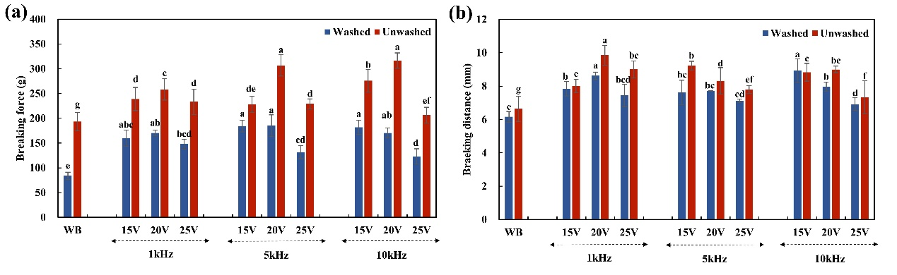 图1. 不同加热条件下漂洗与未漂洗鱼糜的破断力与破断距离