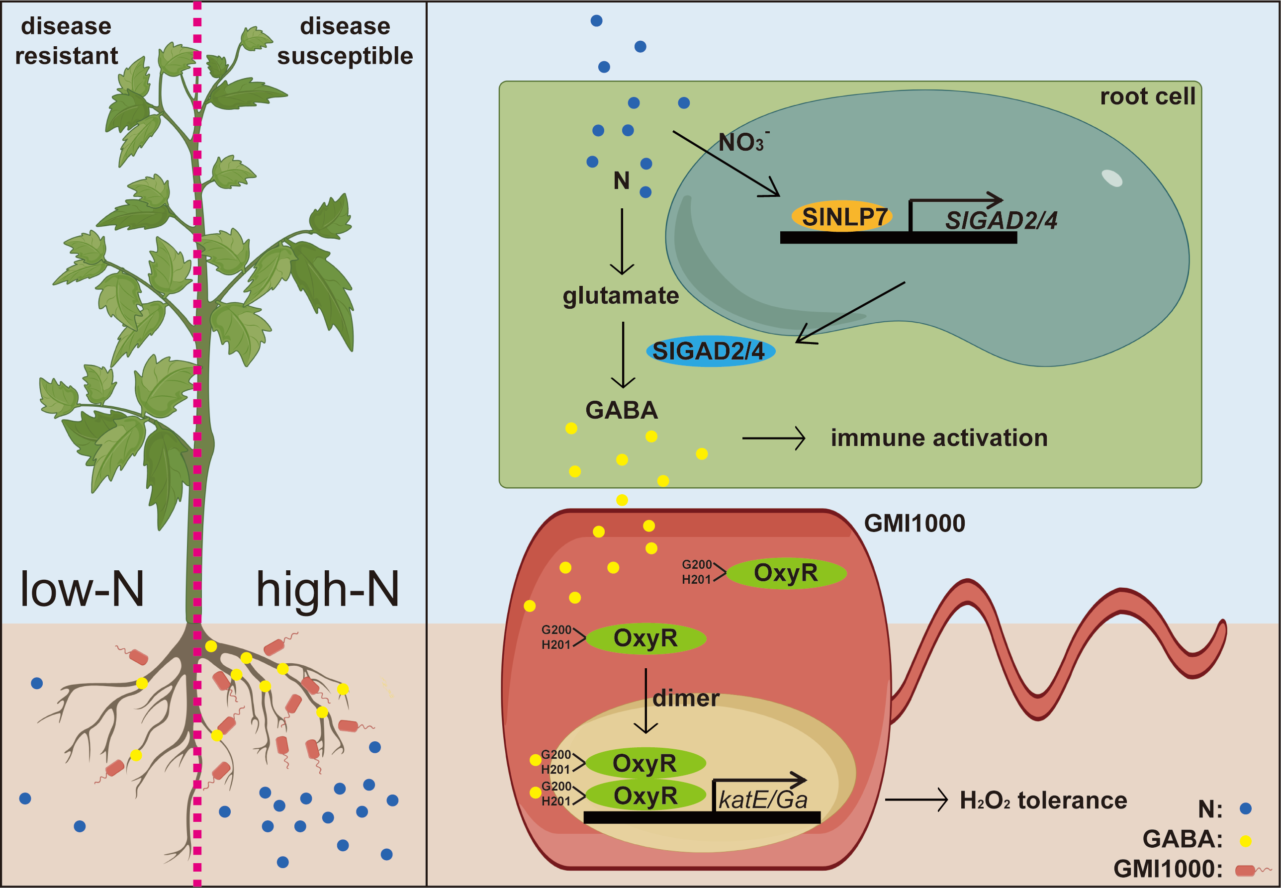 园艺科学与工程学院巩彪团队在《New Phytologist》发表了题为High-nitrogen-induced γ-aminobutyric acid triggers host immunity and pathogen oxidative stress tolerance in tomato and Ralstonia solanacearuminteraction的研究论文。发现随着氮肥施用量的增加,番茄青枯病发病率显著提高。通过对番茄的氮代谢及其衍生物分析,鉴定到五种受氮素水平影响的代谢物。通过外源添加这五种代谢物,发现伽马氨基丁酸(GABA)能显著促进番茄青枯病发生,故确定其为研究靶标。之后,我们发现硝酸盐传感器SlNLP7蛋白通过与GABA合成关键基因SlGAD2和SlGAD4的启动子结合,促进高氮施入下SlGAD2和SlGAD4的表达及GABA的合成,虽然GABA增强了番茄植株的基础免疫,但却展现番茄青枯病病症加剧的表型。因此,我们推测寄主产生的GABA可能会被青枯菌感知并增强其毒力。进一步研究发现,GABA能提高青枯菌的氧化应激能力,并鉴定到调控青枯菌氧化应激的核心转录因子OxyR蛋白可以直接与GABA互作,这种互作促进了OxyR蛋白的二聚化及DNA绑定能力,促进了下游过氧化氢酶基因katE和katGa的表达,增强了青枯菌的抗氧化能力和致病性。该研究揭示了GABA在激活寄主植物免疫和增强病原毒力中的双重作用,建立了番茄与青枯菌互作过程受土壤氮素水平影响的复杂关系。