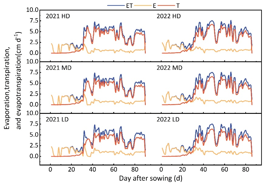 农田生态系统中,蒸散是维持水和能量平衡的关键环节。蒸腾和蒸发作为蒸散的两个组成部分,对作物生产力的影响各不相同。种植密度对作物生长和水资源利用效率有重要影响,然而,针对不同种植密度下蒸散分配情况,以及如何平衡耗水与粮食生产关系的研究还比较匮乏。