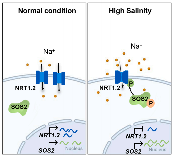 该研究鉴定出NRT1.2/NPF4.6/AIT1是一种非选择性钠离子转运体。拟南芥中过表达NRT1.2会因钠离子积累而降低耐盐性,而nrt1.2突变体提高耐盐性。非损伤微测技术证实NRT1.2具有钠离子吸收功能。在非洲爪蟾卵母细胞中,NRT1.2表现出依赖低pH值且受硝酸盐促进的钠、钾、锂离子转运活性。进一步研究表明,盐过敏感蛋白SOS2通过磷酸化NRT1.2第248位苏氨酸(Thr248)抑制其钠离子转运活性。长期盐胁迫可以诱导SOS2表达,而抑制NRT1.2的表达。因此,盐胁迫条件下,植物通过诱导SOS2表达和激活SOS2激酶活性磷酸化NRT1.2,抑制NRT1.2的钠离子转运活性;另一方面植物通过降低NRT1.2的表达,降低NRT1.2转运体数量;两方面均可降低根系钠离子吸收,提高植物的耐盐性。