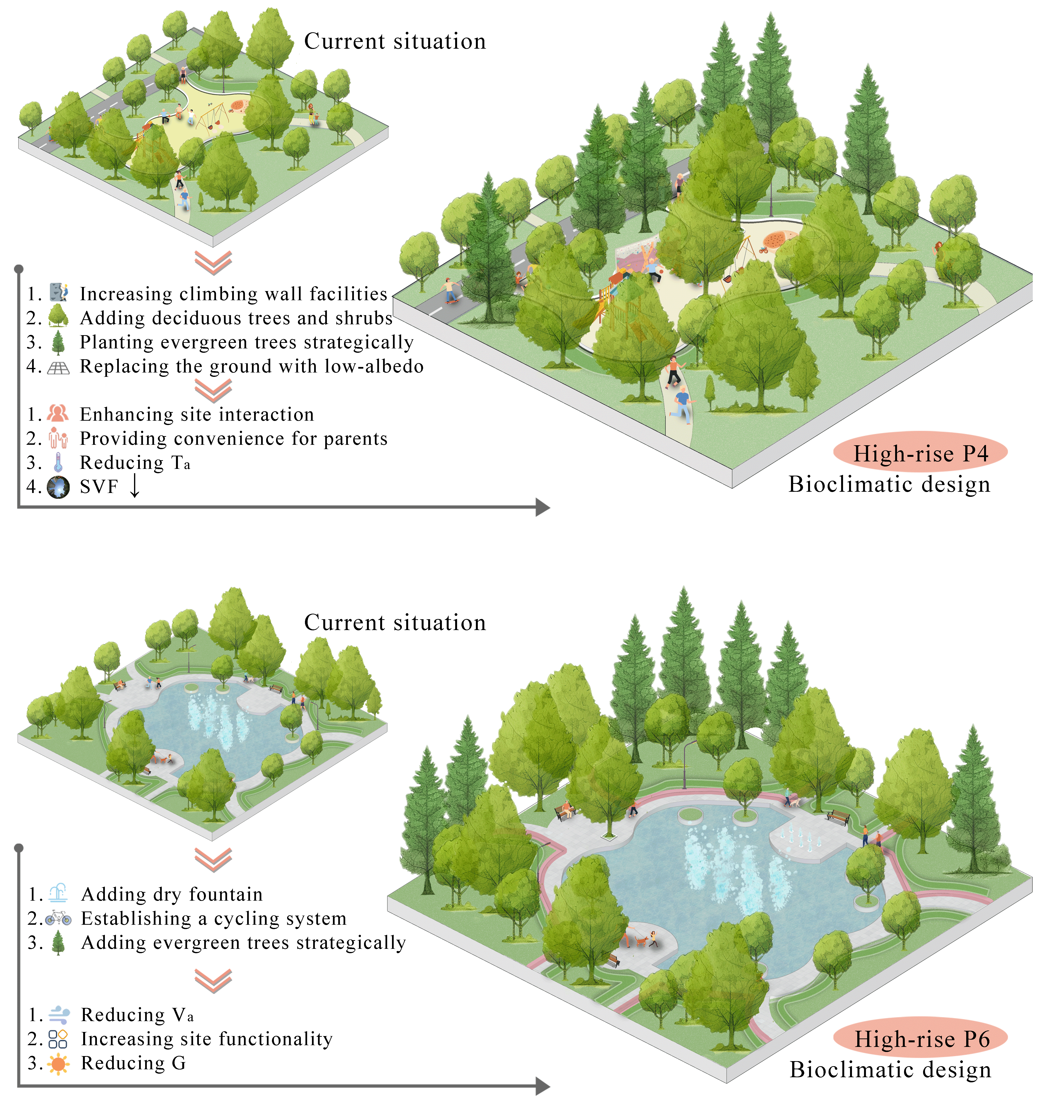 本研究综合运用现场实测、问卷调查和数值模拟相结合的方法,以泰安市为例探究中国寒冷地区高层居住区和多层居住区居民在户外活动空间中的热舒适度差异。通过现场实测和问卷调查,研究了影响户外热舒适度的主要因素,并以生理等效温度(PET)为指标,对两种居住区居民的热感知和热偏好进行了比较分析。研究表明,黑球温度和空气温度是影响热感觉投票的主要因素;高层居住区居民的中性PET范围(3.05°C - 20.17°C)比多层居住区居民的中性PET范围(4.36°C - 19.66°C)更宽;基于室外热基准和居民在夏季对户外活动空间的降温需求以及植被等景观要素的微气候调节作用,提出了以景观空间优化为核心的生物气候设计策略(图1),并通过数值模拟验证了景观优化策略的适用性(图2)。这一经过模拟验证的景观优化策略,不仅为类似居住区的景观更新和规划设计提供了有价值的参考,更对通过景观优化提升居住区宜居性、改善城市微气候具有重要意义。