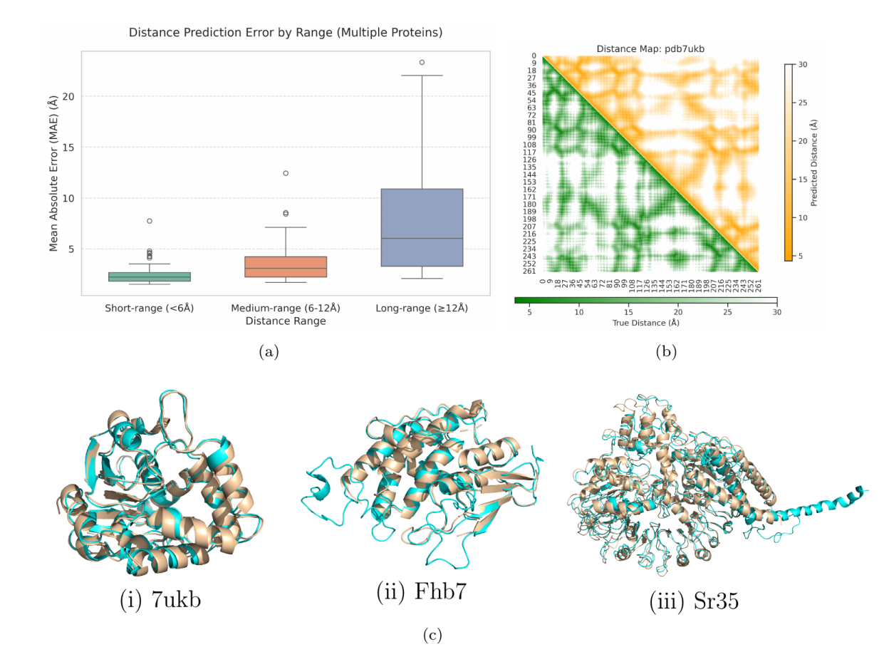 蛋白质结构的精确解析是理解生物微观分子机制、基因精准设计的基础。尽管AlphaFold2在蛋白质结构预测方面取得了显著成果,但如何进一步优化关键功能区域(如酶的活性位点、蛋白-配体结合界面)及独立结构域的预测精度,仍是当前学界关注的核心问题与研究焦点。残基间实值距离预测不仅为解决上述问题提供了高分辨率的几何约束,还能直观反映其内部相互作用与空间组织,从而使模型预测结果具有更强的可解释性。