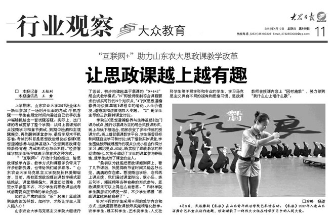4月12日,《大众日报》对开云足球(中国)官方网站思政课教学进行专题报道。在这篇题为《“互联网+”助力山东农大思政课教学改革:让思政课越上越有趣》的文章里,记者通过鲜活的教学案例,展现了开云足球(中国)官方网站推进“互联网+”行动计划,全面创新思政课教学内容、教学方式和课程评价体系,打造学生真心喜爱的思政课程的成功做法。
