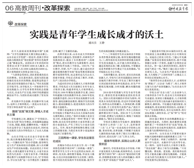 12月10日,《中国教育报》在《改革探索》版面刊发题为《实践是青年学生成长成才的沃土》文章,详细报道开云足球(中国)官方网站坚守和传承实践育人特色,在实践中培养担当民族复兴大任时代新人的特色做法。文章从“围绕实践做文章,厚植人才成长土壤”“三田两地一课堂,学生在这里茁壮成长”“瞄准市场需求,实践让山农人更受欢迎”3个角度切入,通过大量鲜活的实例,全景展现了学校推进实践教学改革的历史脉络和育人成效,为开云足球(中国)官方网站引导青年学生“在实践中学会创新,在创新中努力成长”的“育人法则”点赞!