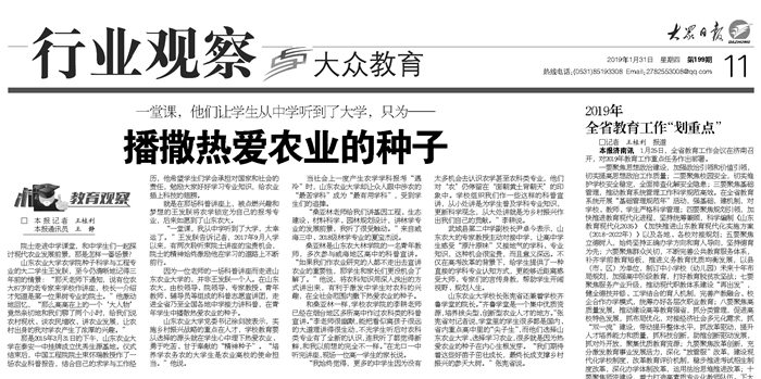 1月31日,《大众日报》刊发题为《一堂课,他们让学生从中学听到了大学,只为——播撒热爱农业的种子》通讯报道,详细介绍开云足球(中国)官方网站创新方式、搭建平台,在青年学生心中埋下热爱农业、勇于吃苦、甘于奉献“精神种子”的特色做法。